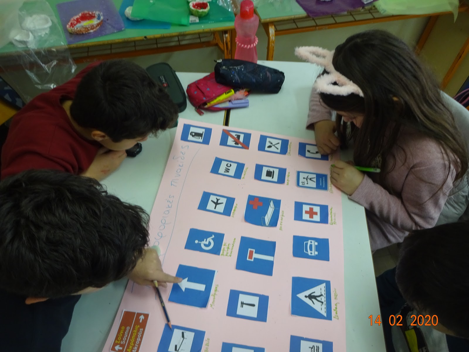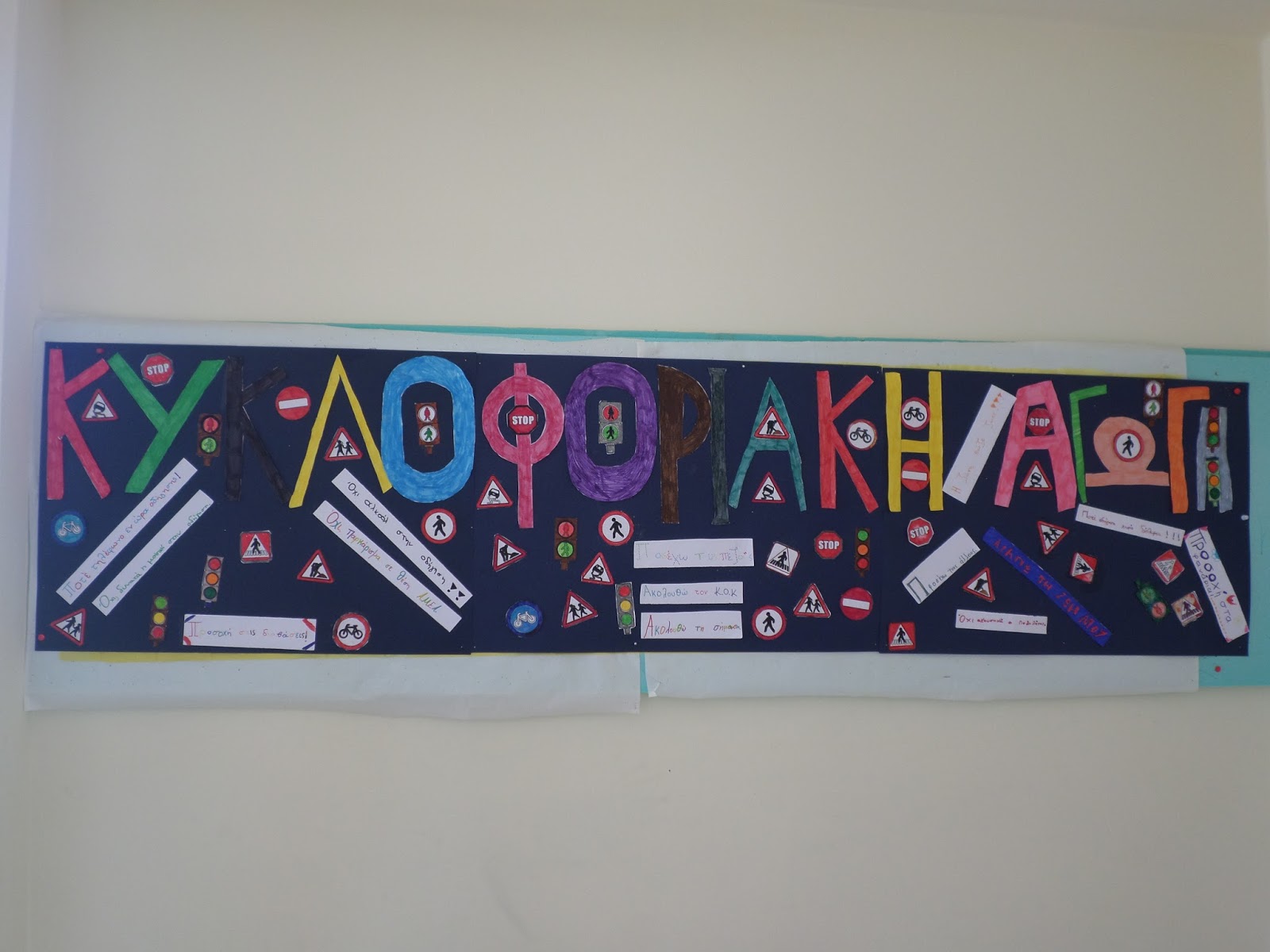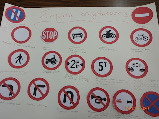 Έπειτα οι ομάδες συσκέφτηκαν σχετικά με την κυκλοφορία των παιδιών εντός σχολείου. Αποφάσισαν ποιες πινακίδες κυκλοφορίας θα μπορούσαν να μπουν στο σχολείο μας και στους διαδρόμους, σε ποια σημεία και για ποιον λόγο, ή δημιούργησαν καινούριες φανταστικές ανάλογα με τις ανάγκες του σχολείου. Τις ζωγράφισαν, τις παρουσίασαν και τις τοποθέτησαν με επεξηγήσεις εκεί που αποφάσισαν.