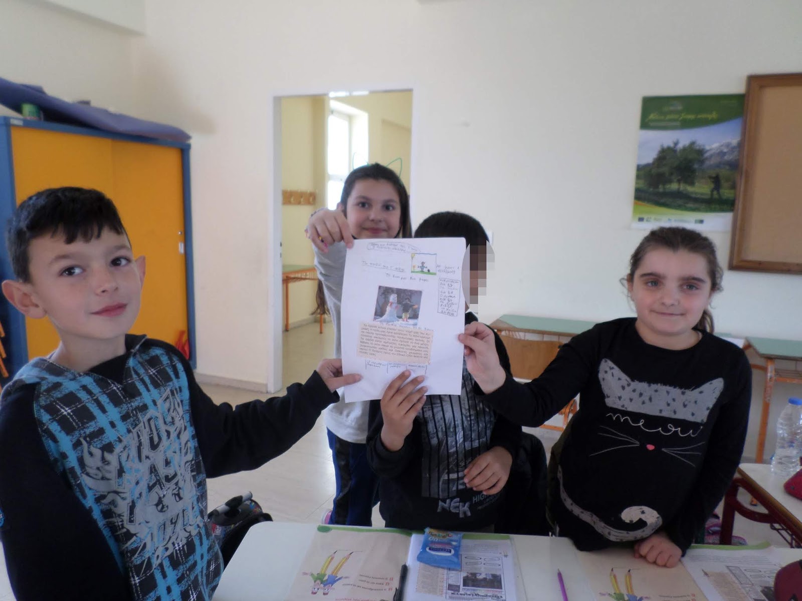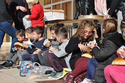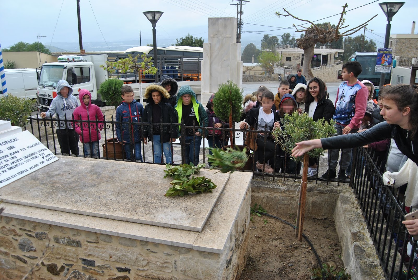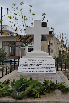 Πριν επιστρέψουμε στο σχολείο, επισκεφτήκαμε τον τάφο του ήρωα της Επανάστασης Μιχαήλ Κόρακα. Ο τάφος του σεμνός και απέριττος βρίσκεται στην πλατειά του χωριού Πόμπια παραπλεύρως της εκκλησίας του Αγ. Γεωργίου και του Ηρώου. Ο Μιχάλης Καρούζος γεννήθηκε το 1797 στην Πόμπια. Την επωνυμία «Κόρακας» πήρε από τους Τούρκους επειδή έπεφτε πάνω τους τούς στα γιουρούσια θυελλώδης και τους έφερνε την καταστροφή και το θάνατο.