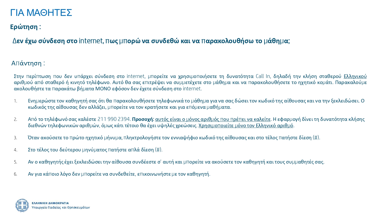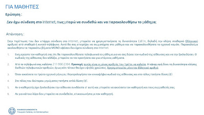 Τι να κάνετε σε περίπτωση που δεν έχετε σύνδεση στο internet Δημοσιεύθηκε 8 Απριλίου, 2020 από τον/την 3o Dimotiko Tympakiou Για να παρακολουθήσετε το μάθημα μέσω της πλατφόρμας Cisco Webex σε περίπτωση που δεν έχετε πρόσβαση στο ίντερνετ, μπορείτε να κάνετε τις παρακάτω ενέργειες (πατήστε πάνω στην εικόνα)