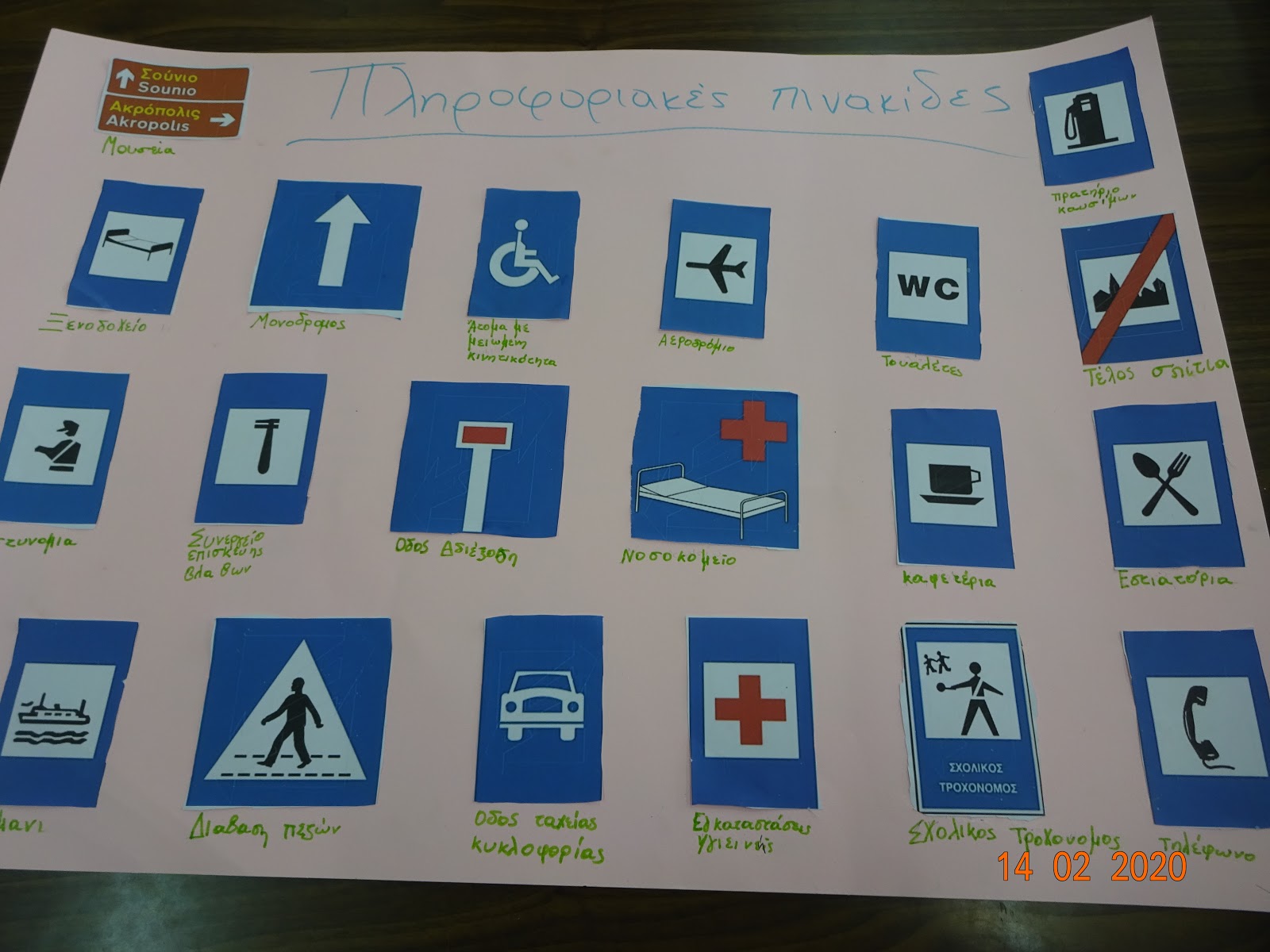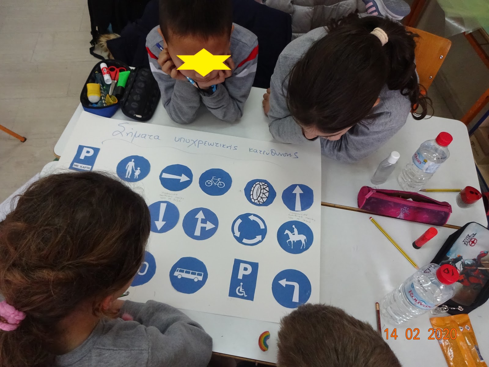 Το ταξίδι τους στον κόσμο της κυκλοφοριακής αγωγής ξεκινά με τη γνωριμία τους με τα σήματα και τις πινακίδες! Αφού έγινε παρουσίαση πολλών πινακίδων της οδικής σήμανσης, οι μαθητές χωρίστηκαν σε ομάδες, έκοψαν τα σήματα που τους δόθηκαν και έφτιαξαν κολάζ, κολλώντας τα σε χαρτόνια ανά κατηγορία (σήματα κινδύνου, απαγόρευσης, κ.τ.λ.). Στη συνέχεια δόθηκε στους μαθητές φυλλάδιο με τη σημασία των σημάτων και τους ζητήθηκε να συνεργαστούν, ώστε να αντιστοιχίσουν τη σωστή σημασία με το σωστό σήμα.