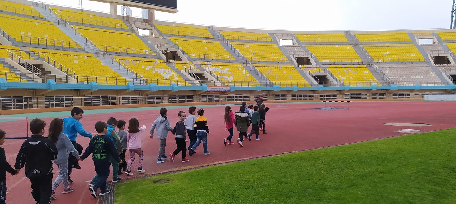 Έπειτα, βγήκαμε στο γήπεδο, είδαμε τις υποδομές του και γνωρίσαμε τα αθλήματα του στίβου.