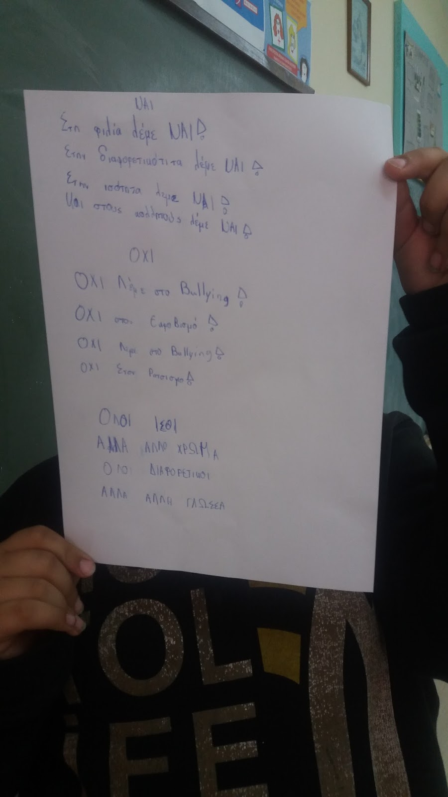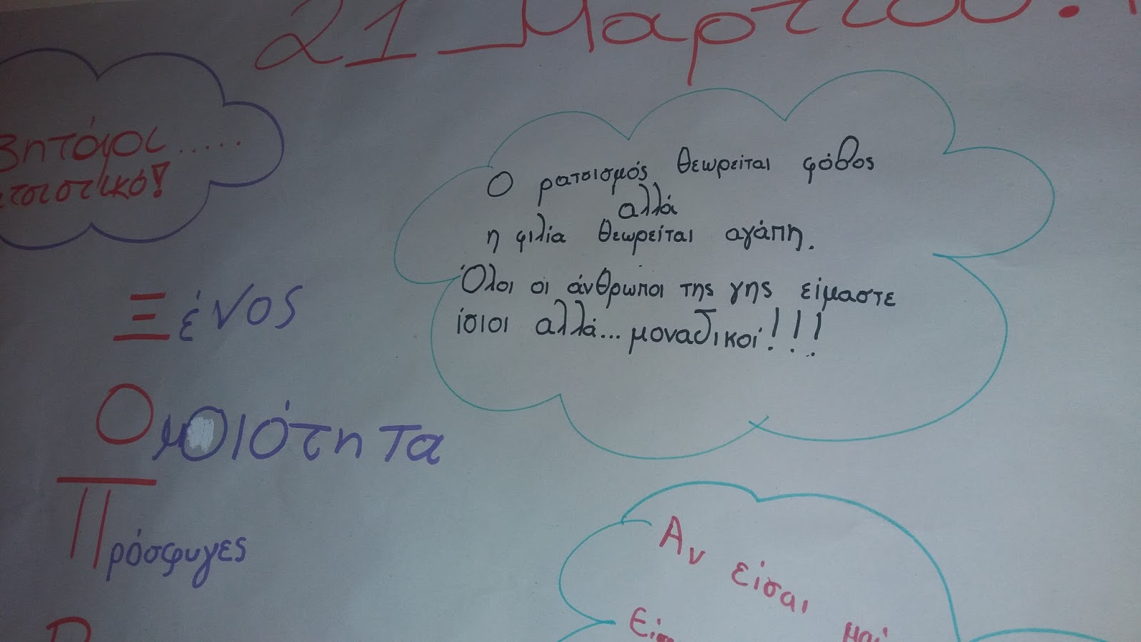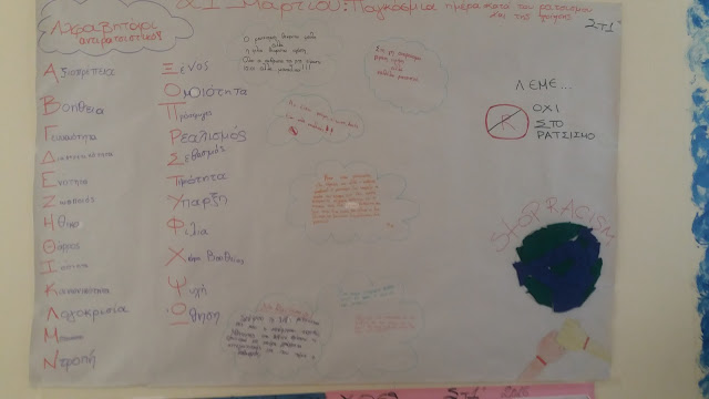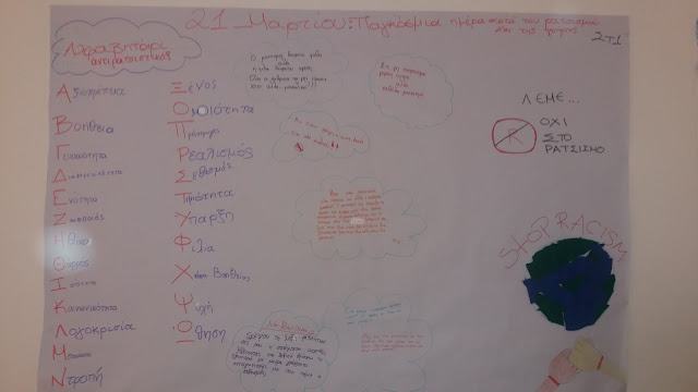 Με αφορμή την παγκόσμια ημέρα κατά του ρατσισμού και της ποίησης , έπειτα απο προβολή κάποιων βίντεο ευαισθητοποίησης και ανάγνωση διάφορων σχετικών κειμένων, δημιουργήσαμε έναν πίνακα συναισθημάτων. Συνδυάζοντας τις δύο παγκόσμιες ημέρες γράψαμε τα δικά μας ποιήματα για τον ρατσισμό. Γνώμεις και σκέψεις ενώθηκαν και …το αποτέλεσμα σας το παρουσιάζουμε παρακάτω!!!!