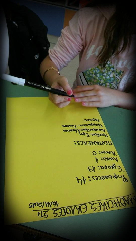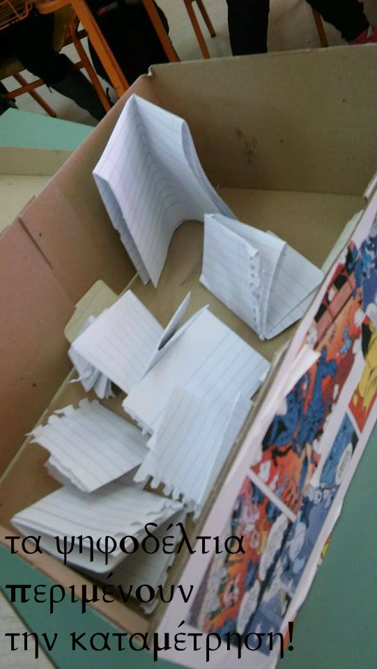 Ψήφισαν ολοι οι μαθητές. Η κάλπη άνοιξε και τα παιδιά περιμεναν με αγωνία τα αποτελέσματα. Με τη βοήθεια 2 παιδιών, ανοίγαμε τα ψηφοδέλτια και καταγράφαμε τους σταυρούς στον πίνακα!Τα έγκυρα ψηφοδέλτια ήταν 14 εντός των οποίων και ένα λευκό. Η αγωνία ήταν μεγάλη και τα χειροκροτήματα έπεφταν βροχή!